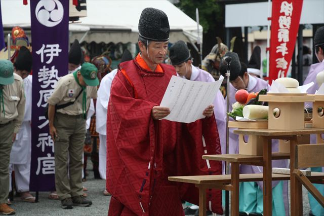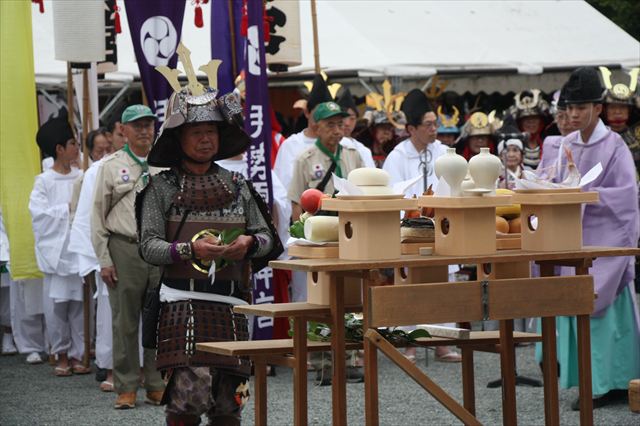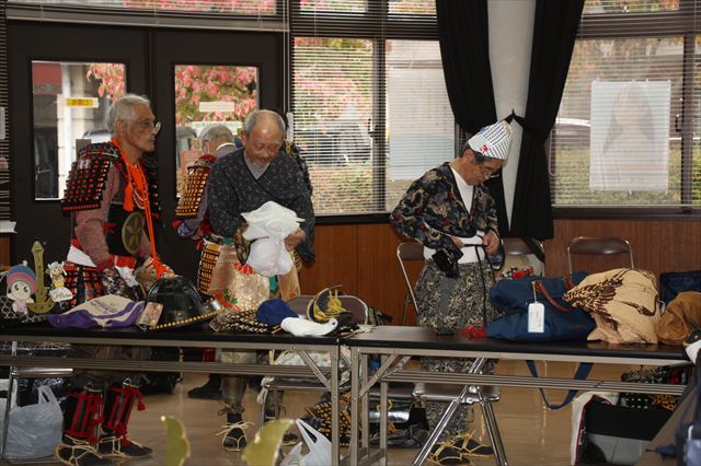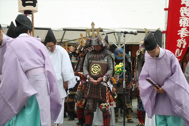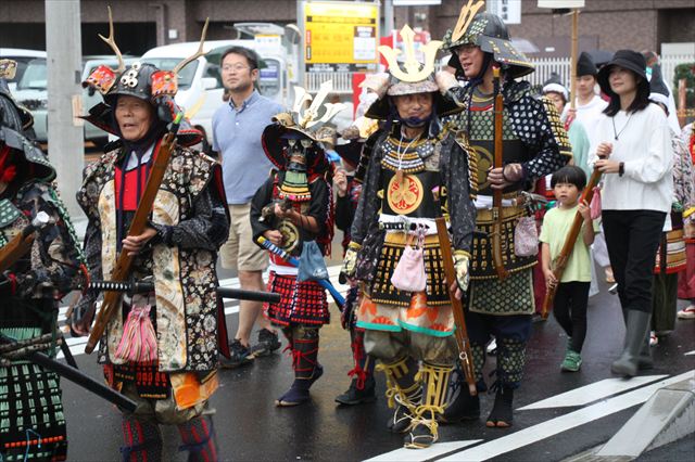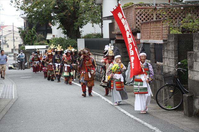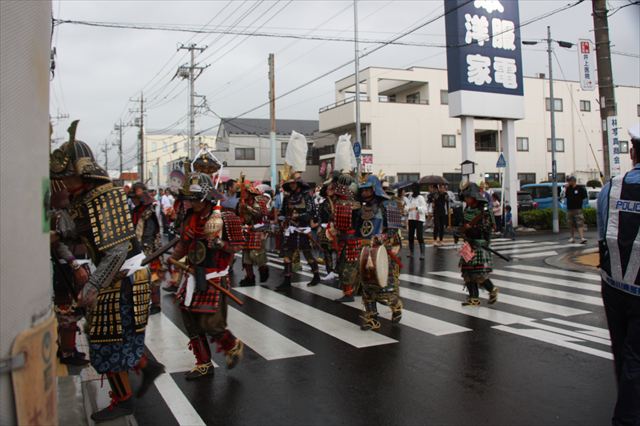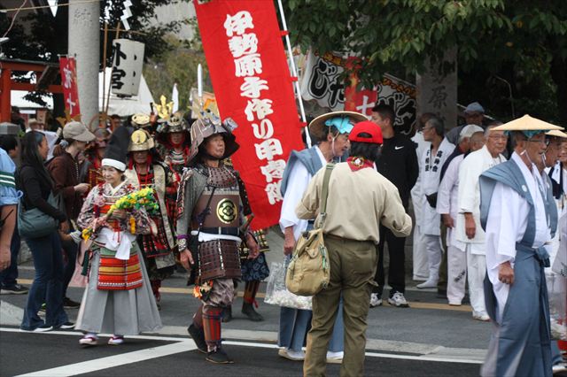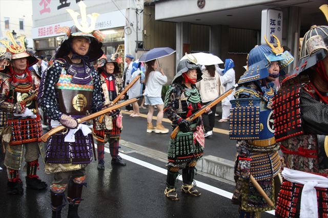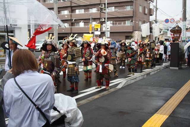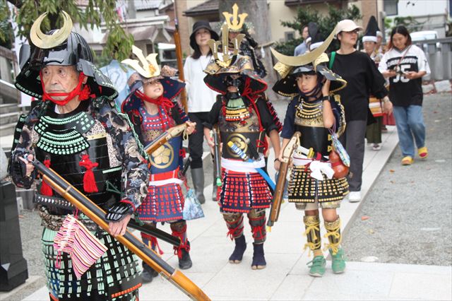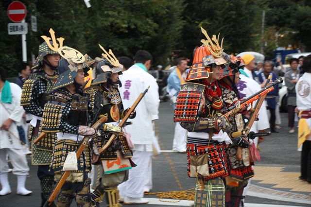 【2025/10/19】伊勢原大神宮神幸祭に出陣 2025年 2025.10.24 10月19日(日)に催行されたい伊勢原大神宮の神幸祭に武者行列で出陣しました。当日は曇天の空からやがて小雨になり、雨が強くなってきたところで甲冑隊だけパレードから退避しました。あいにくの天候で沿道にも人がまばらなため、少々残念な行列となりましたが、境内での式典に華を添え、沿道の人々にも喜んでいただけました。参加した甲冑武者18人(うち少年隊3人・法螺貝隊・鉄砲隊)となでしこ隊3人、お疲れさまでした。
