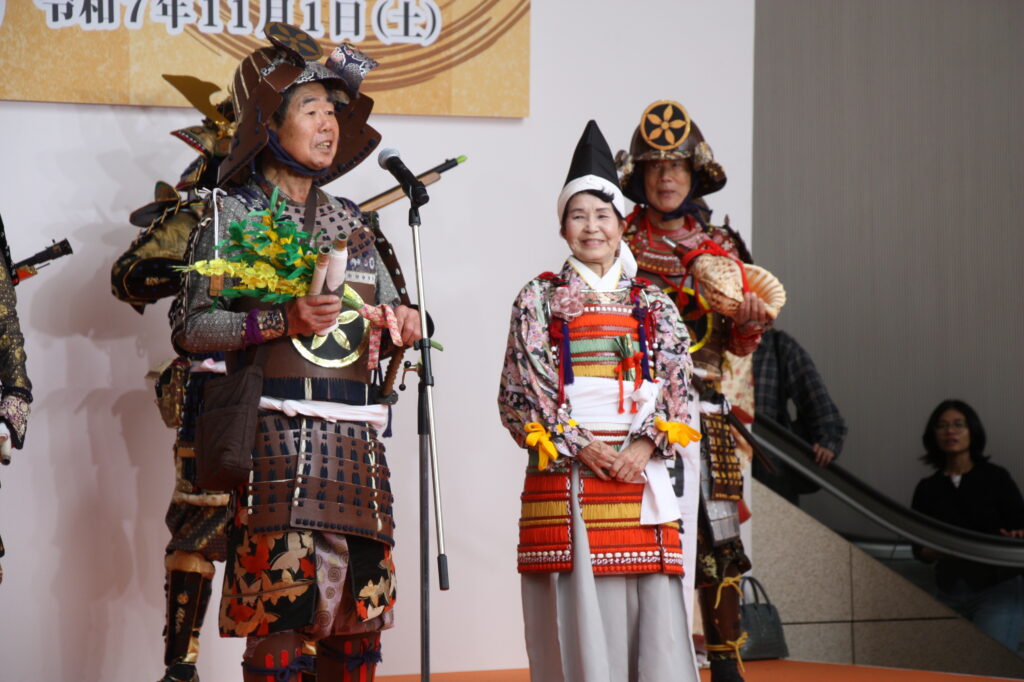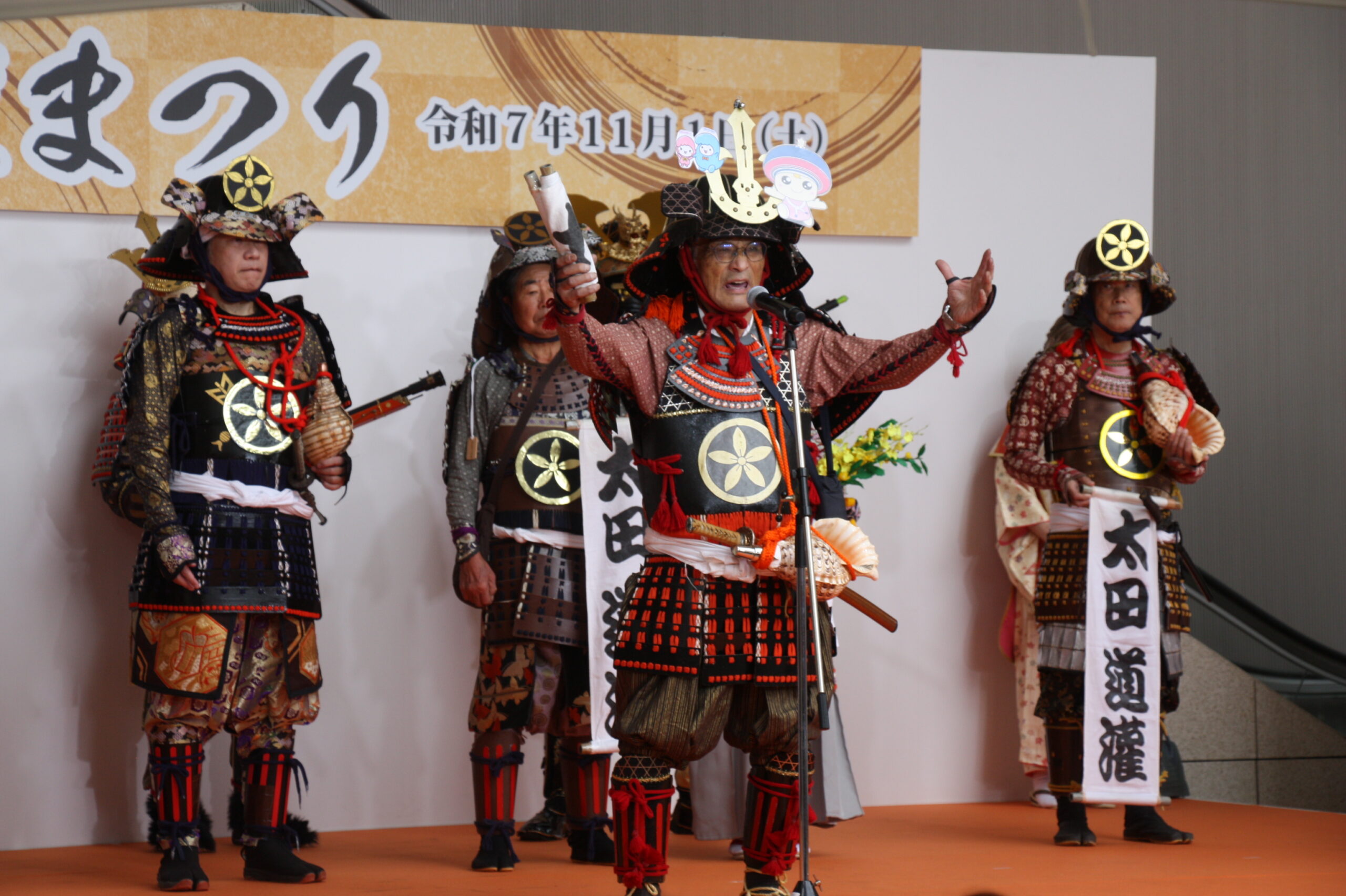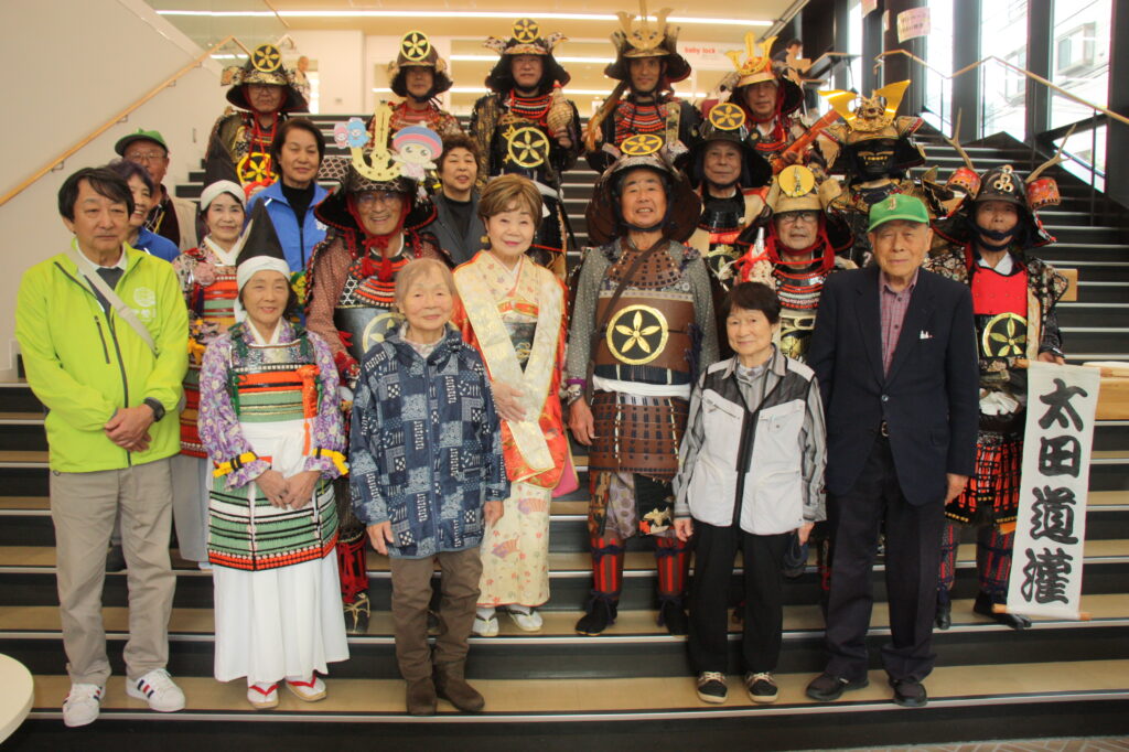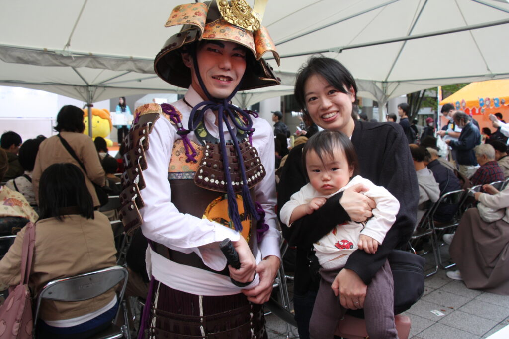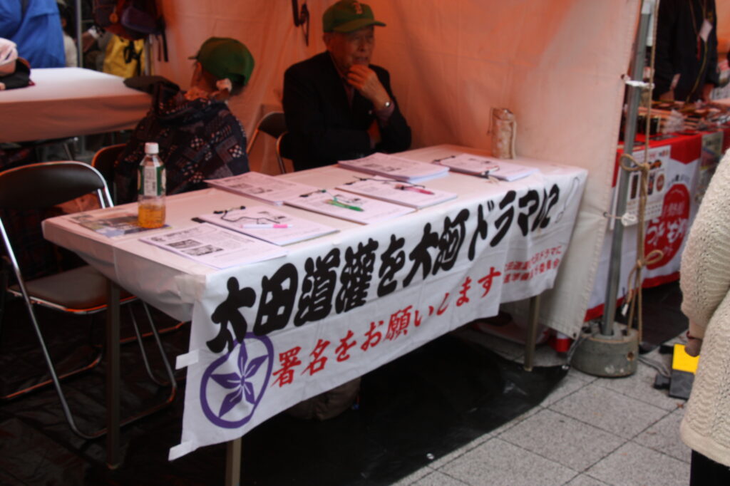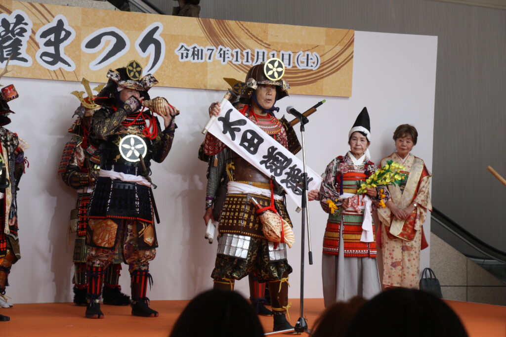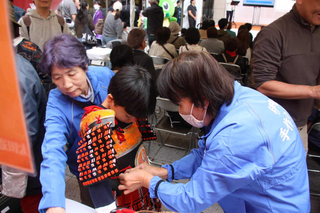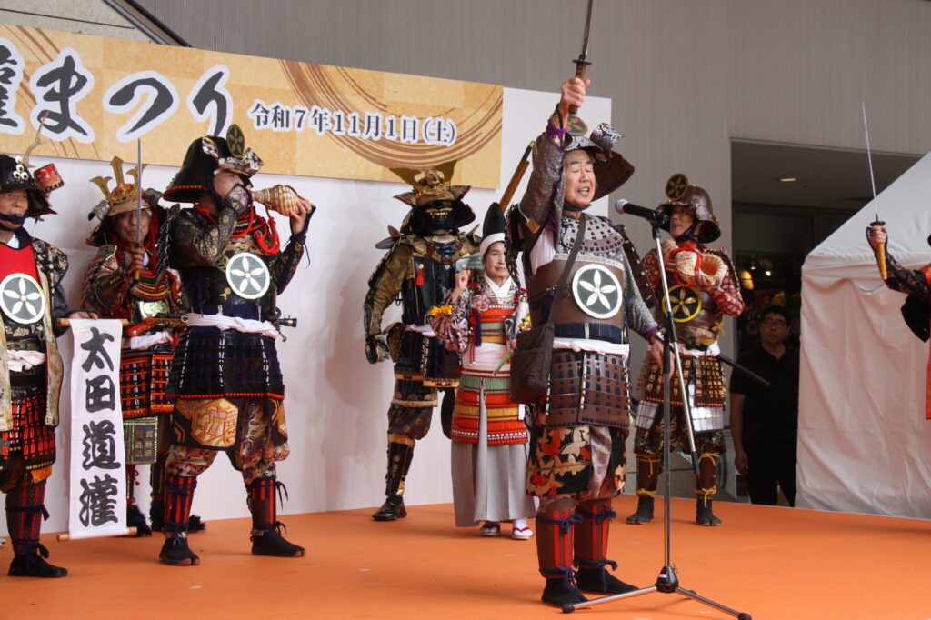 「太田道灌公を大河ドラマに」(観ボラ)のメンバーとともに、道灌顕彰のために大挙バスで遠征しました。ステージで寸劇「五人の太田道灌」を披露したほか、観ボラと合同のブースで「甲冑着付け体験」も実施し、約1時間の間に子どもから大人まで15人ほどの方に甲冑を着ていただき、それぞれ大きな笑顔で写真を撮っていらっしゃいました。同時に行われていた「白塗りメイク体験」をしての甲冑姿は、まるで舞台役者のようでした。