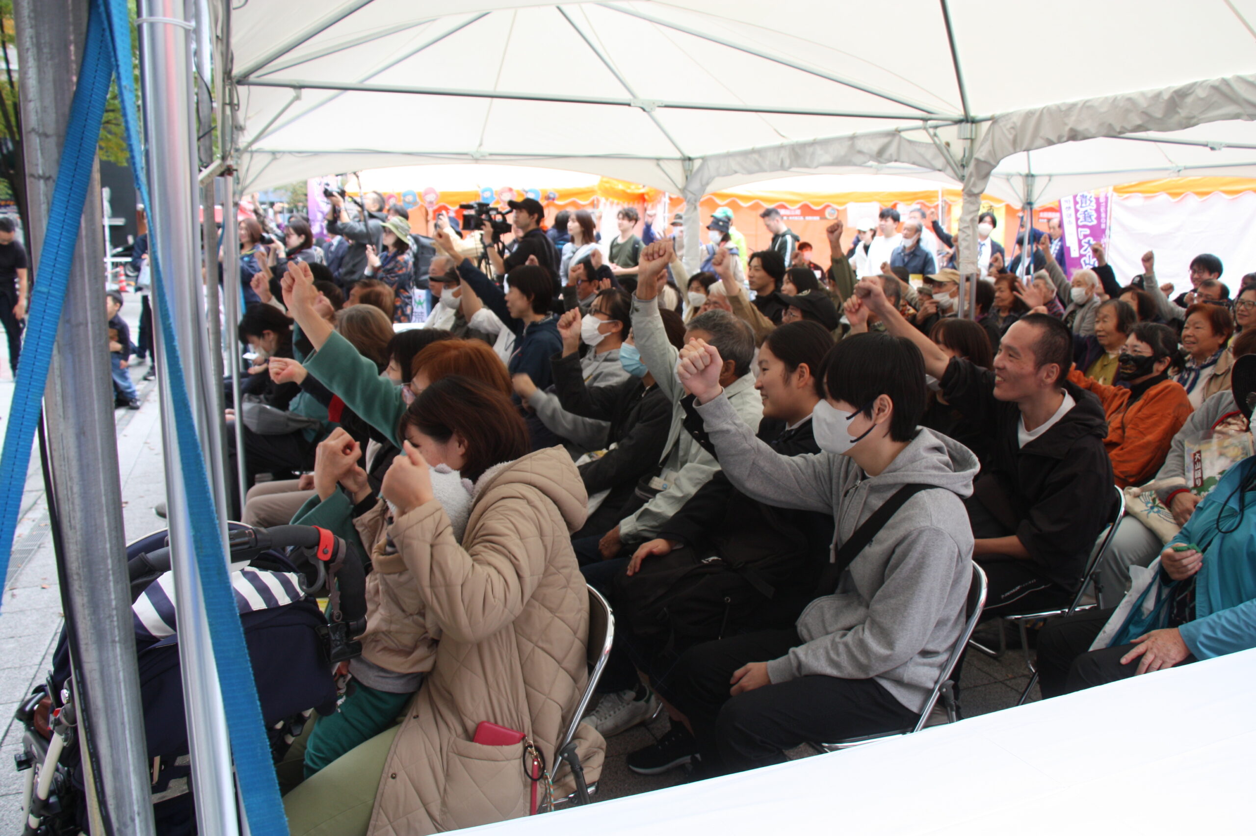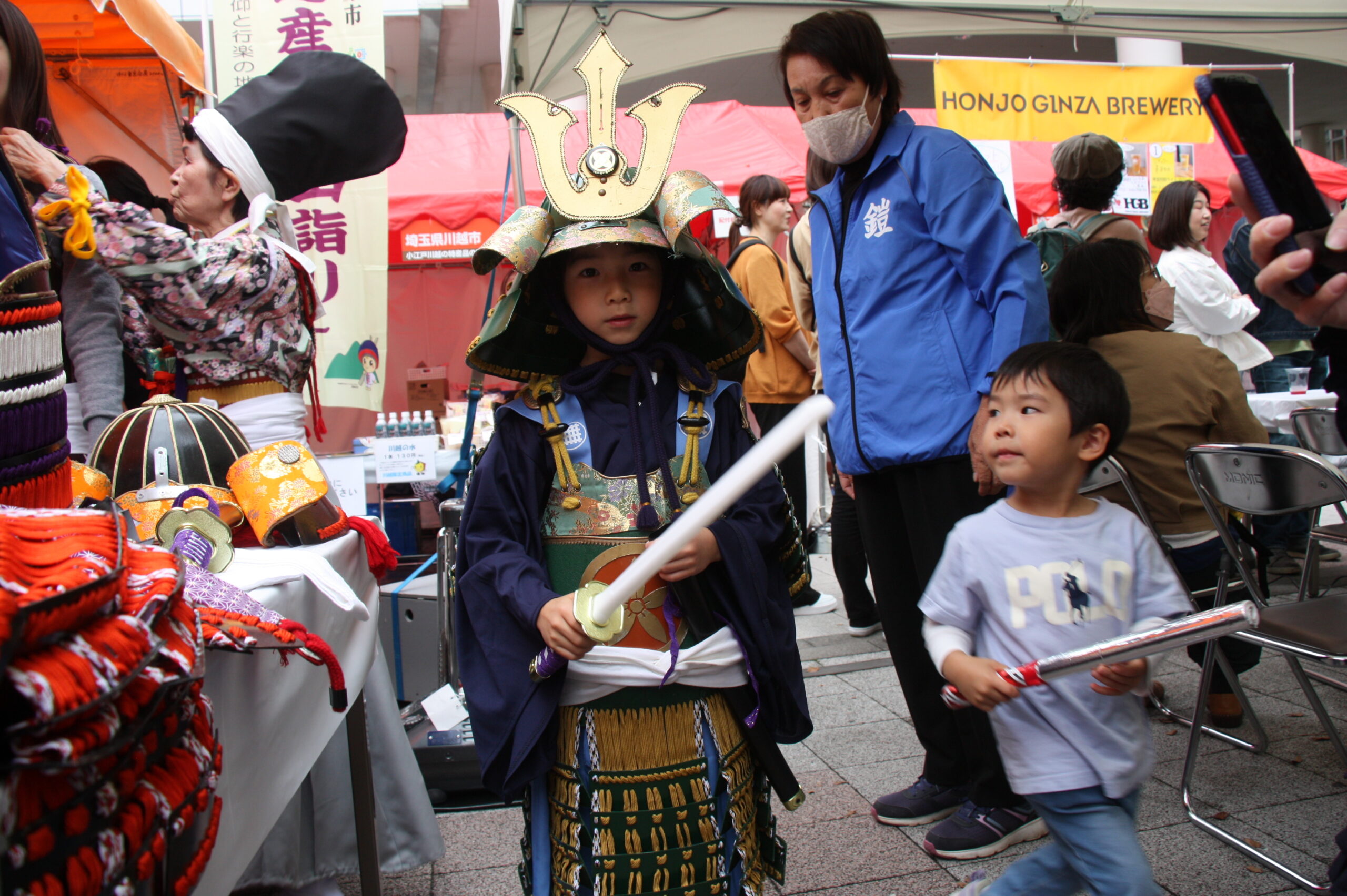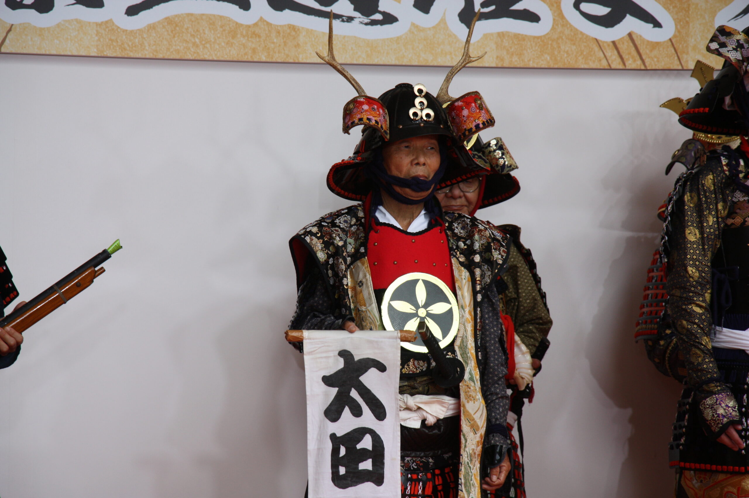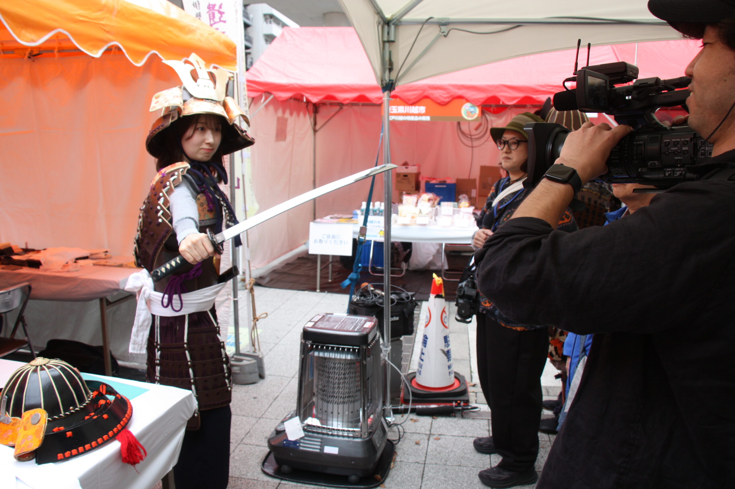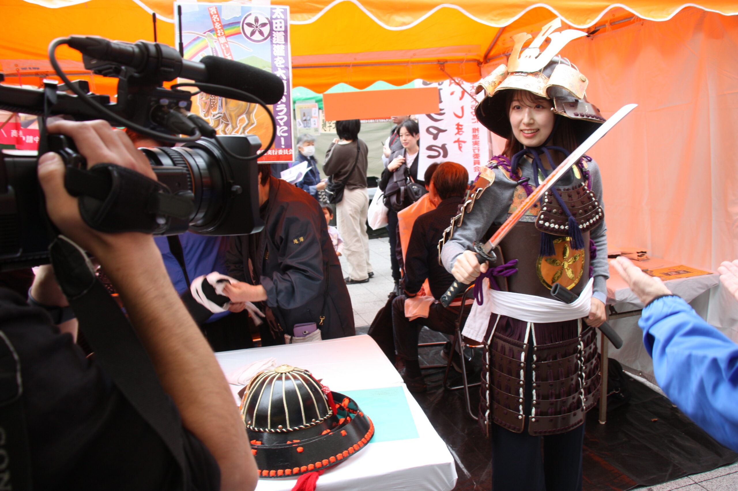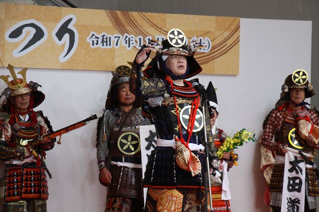「太田道灌公を大河ドラマに」(観ボラ)のメンバーとともに、道灌顕彰のために大挙バスで遠征しました。ステージで寸劇「五人の太田道灌」を披露したほか、観ボラと合同のブースで「甲冑着付け体験」も実施し、約1時間の間に子どもから大人まで15人ほどの方に甲冑を着ていただき、それぞれ大きな笑顔で写真を撮っていらっしゃいました。同時に行われていた「白塗りメイク体験」をしての甲冑姿は、まるで舞台役者のようでした。