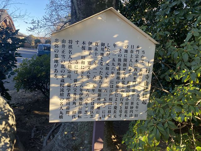 中央公民館に集合したあと、自動車に分乗して「岡崎四郎義實」ゆかりの無量寺(岡崎城跡)、「善波太郎重氏」」ゆかりの石塔群、「太田道灌」ゆかりの洞昌院(胴塚)と七人塚、丸橋忠弥や宝井其角の墓がある上行寺、「石田次郎為久」ゆかりの円光院の6カ所を巡りました。